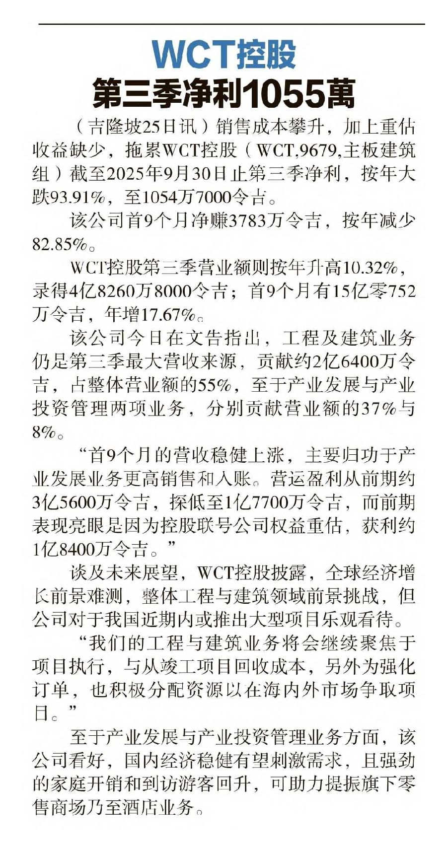 PETALING JAYA, 25 NOVEMBER 2025 - 销售成本攀升,加上重估 收益缺少,拖累WCT控股(WCT,9679,主板建筑组)截至2025年9月30日止第三季净利,按年大跌93.91%,至1054万7000令吉。